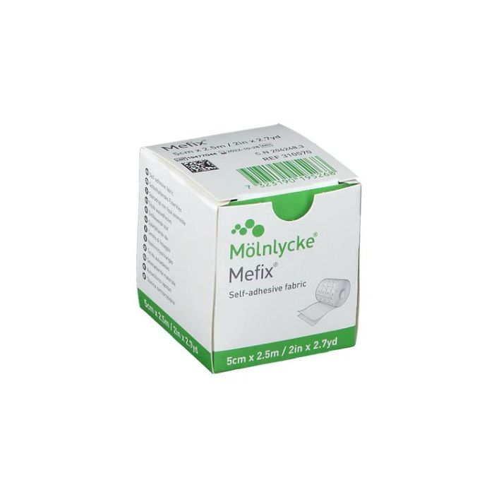 Mefix är tillverkat av ett poröst, elastiskt non-wovenmaterial i polyester som är täckt med en hudvänlig polyakrylathäfta som ger säker fixering. På baksidan sitter ett måttförsett skyddspapper som är lätt att ta av.